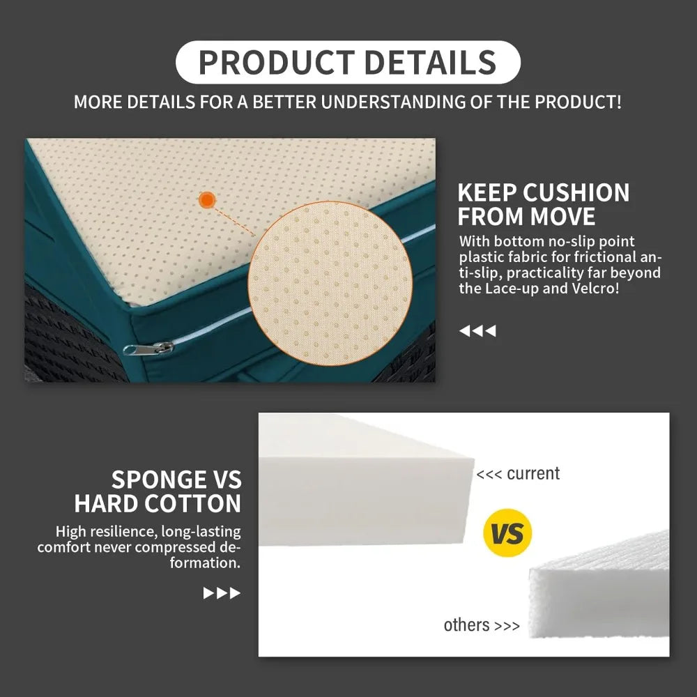 - Comfortable and Non-slip: seat cushions(4 inches) with high resilience sponge and bottom anti-slip dotted plastic fabric; anti-slip and practicality are wholly better than lacing, velcro or hook, match up plump back cushions with water-resistant, color retention fabric covers for lasting appeal with outdoor patio furniture